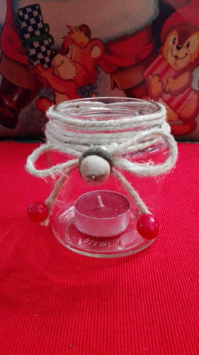 Con dei barattoli di vetro è possibile realizzare dei simpatici portacandela da mettere sulla credenza o sul davanzale della finestra oppure regalarlo.Per realizzarlo è sufficente avvolgere dello spago attorno alla filettatura e creare un fiocco che andrà decorato con oggetti di nostra scelta, all’interno, troverà posto una candela di colore rosso.